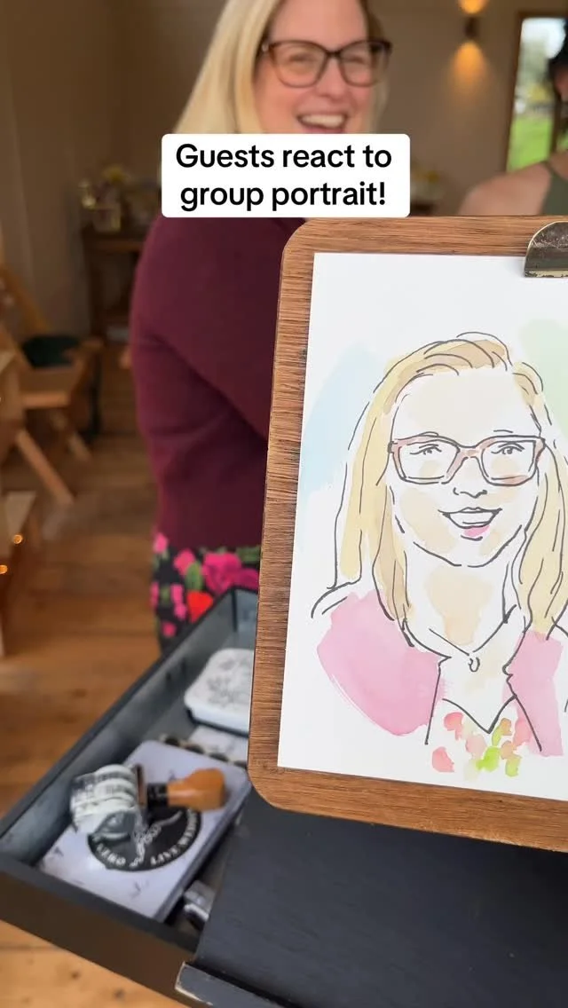 Quick and flattering artistic head and shoulder and full length portraits in ink and watercolour of your guests!