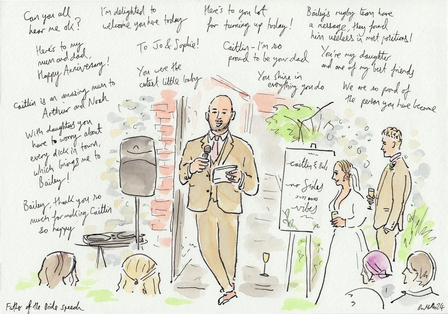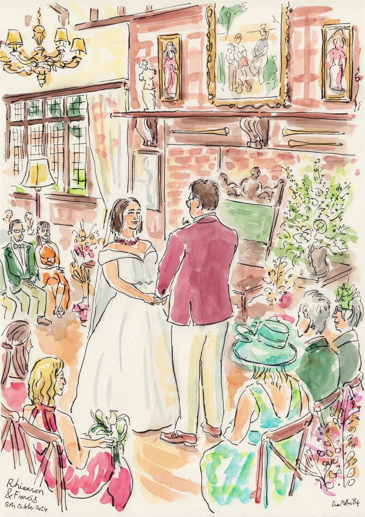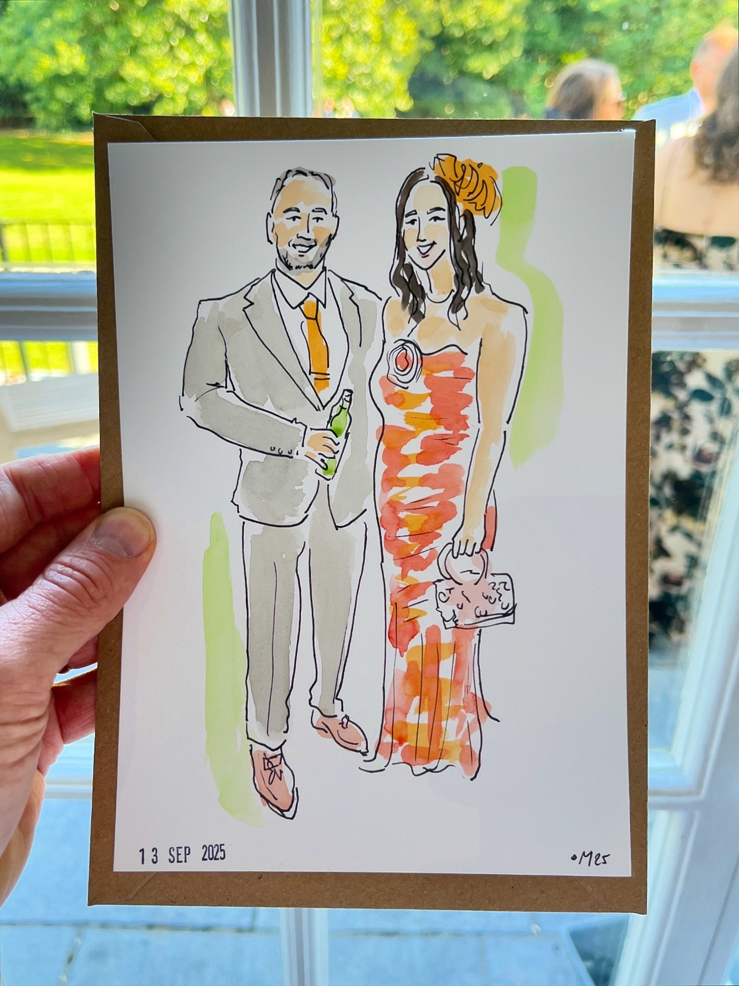 A medium size illustration of your ceremony or yourselves in front of the venue and live guest portraits during the drinks reception.
